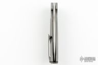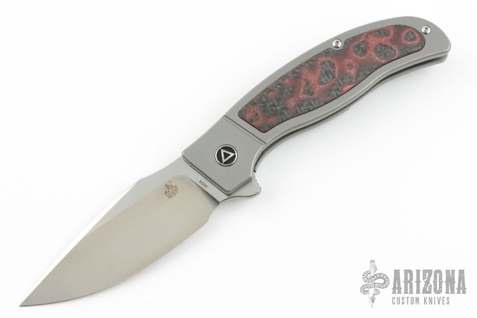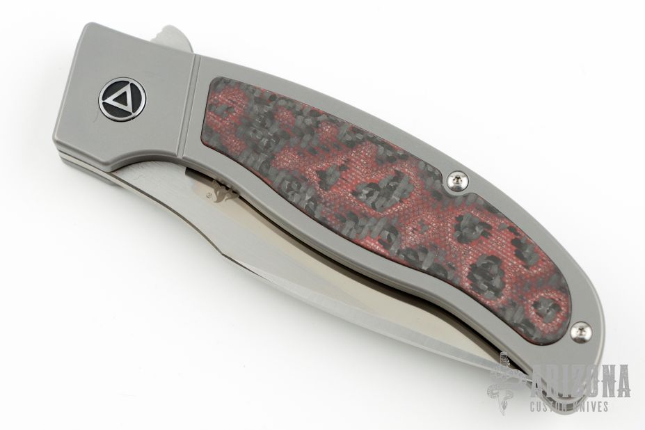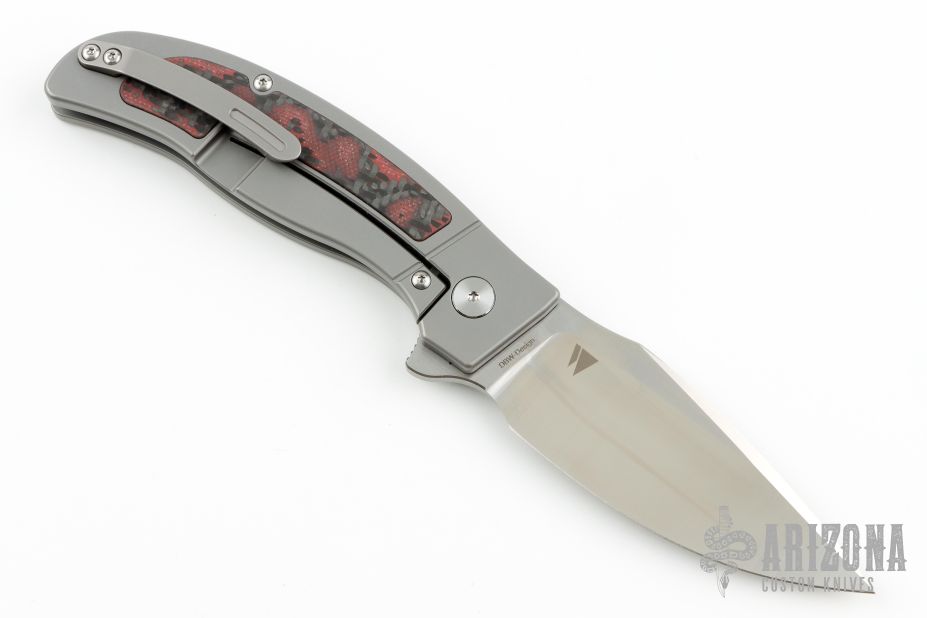 The Legatus by Dutch Blade Works features a satin finished blade with flipper. The handle has a blasted titanium frame with matching tip up clip and backspacer with lanyard pin, red G-10/carbon fiber inlays, stainless lockface insert, ceramic detent and bearings. Very nice action. Nice in hand. Comes with zippered case. These are a limited run of 100. Has a couple light scuffs, excellent condition otherwise.