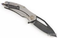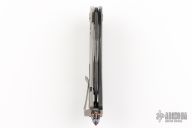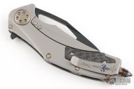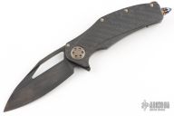 This Matrix-R by Marfione Custom Knives features a DLC two-tone Apocalyptic blade with notched thumbrest and flipper. The handle has a carbon fiber and DLC Apocalyptic finished titanium frame with matching tip up clip and titanium backspacer and glass breaker at the butt. DLC hardware. Comes with original zippered case, box and papers. Has a couple light scuffs, excellent condition otherwise.