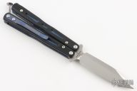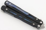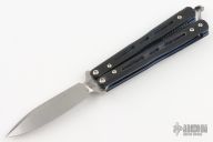 This Model 32 Morpho Balisong by Benchmade has a stonewashed spear point D2 stainless steel blade. Handle is black G-10 with blue anodized titanium liners and milled stainless steel spacers. Blue anodized titanium tip up clip.  Excellent Condition.