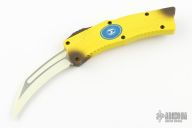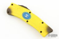 - Handle: Stabnana yellow aluminum handle with a blue Heretic Knives logo.