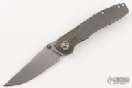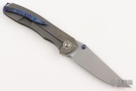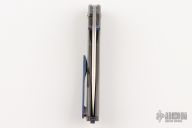This D.U.K. by Kody Eutsler features a matte finished blade with dual black timascus thumbstuds. The handle has a milled titanium frame with inlaid micarta bolsters, titanium pivot collars, black timascus backspacer and tip up clip with hidden screws. Rides on bearings, nice detent, lockup and blade seating. Comes with original box and COA. Excellent condition.