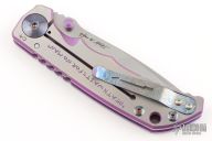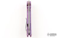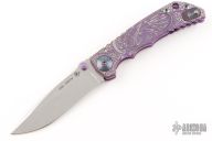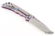 This Harsey framelock folder by Spartan Blades features a stonewashed drop point S45VN blade with dual thumbstuds and a notched thumbrest. The handle has a two tone anodized titanium frame with a laser engraving a tip up titanium clip and filler tab. Has nice detent, lockup, and blade seating. Comes with original box. Excellent condition.