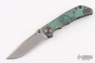 This Harsey framelock folder by Spartan Blades features a stonewashed drop point S45VN blade with dual thumbstuds and a notched thumbrest. The handle has an anodized titanium frame with a laser engraving a tip up titanium clip and filler tab. Has nice detent, lockup, and blade seating. Comes with original box. Excellent condition.