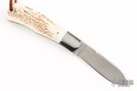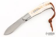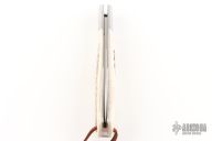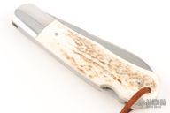 This Lockback by Mike Rothman features a hand rub satin finished blade with nail nick. The handle has mirror polished 416 stainless steel bolsters with integral liners, stag covers, jeweled interiors of liners, and an A2 steel spring. Nice lockup and blade seating. Comes with zippered case and COA dated Blade 2024. New from maker!