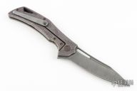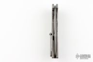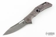 This Swish Flipper from Olamic Cutlery features a Damasteel clip point blade with milled fullers, thumbhole and flipper. The handle has an anodized and hand carved (by Olamic) titanium frame with a floating titanium backspacer, Damasteel tip up clip with ceramic ball. Screws and pivot have been anodized. Great detent, lock up and blade seating. Marked "88/100" inside the backspacer. Includes padded and zippered case, Olamic pivot tool and maker's card dated 05-11-2019. Excellent condition.