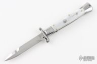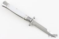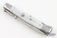 This Swing Guard Lockback Auto by AKC Italy has a polished stainless steel spear point blade with false top edge. The handle has imitation pearl scales with stainless steel bolsters, liners, and stainless steel back spacer and lock. Excellent condition.