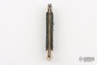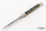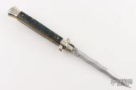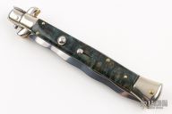 This pick lock auto by Frank Beltrame features a Kris ground blade with a false top edge. The handle has nickel silver guard and rear bolster and blue maple burl scales, brass liners, steel backspacer with round lock tab. Has nickel silver button and safety. Has some light scuffs and scratches, excellent condition.