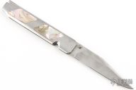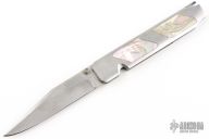 This Lockback by Ralph Dewey Harris features a Damascus blade with dual thumbstuds. The handle has a Damascus frame with abalone inlays. Has some light scratches and patina, otherwise good condition. Comes with a zippered case.