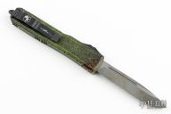 This Ultratech OTF automatic by Microtech features a S/E black blade with a partially serrated edge. Distressed green aluminum contoured frame with black hardware and tip down stainless steel clip. Dated 10/2021 and s/n 048. Includes original box and papers. Excellent condition.