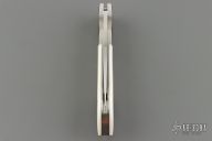 This lockback folder by WE Ankrom features a hand rub satin finished blade with nail nick. The handle has dovetailed titanium bolsters, walrus ivory covers, titanium liners, and a stainless steel lockbar. Has a couple light scratches, excellent condition otherwise. Comes with a zippered case.