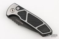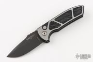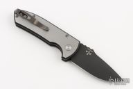 This collaboration between Protech and Les George features a black blade with notched thumbrest. The handle has a two-tone stainless steel frame with a black stainless steel tip up clip, has a black lip pearl inlay in the push button. Comes with original box, drawstring pouch and papers. Excellent condition. #13 of 50.