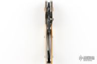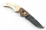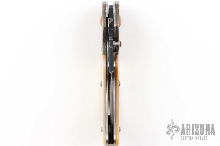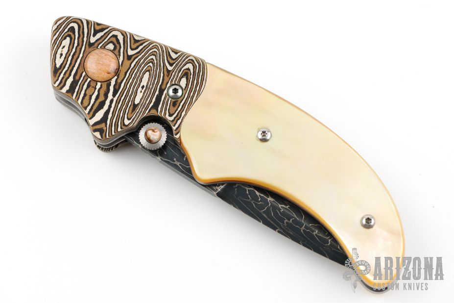 This is a beautiful linerlock by Jot Singh Khalsa features a Damascus blade with single thumbstud with abalone inlay. The handle has 3-alloy mokume bolsters with stone inlaid pivot, gold lip pearl scales, stainless steel liners and backspacer. Smooth action, easy to open. Nice detent and lockup. Excellent condition. Comes with a zippered case.