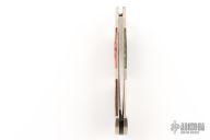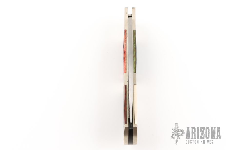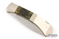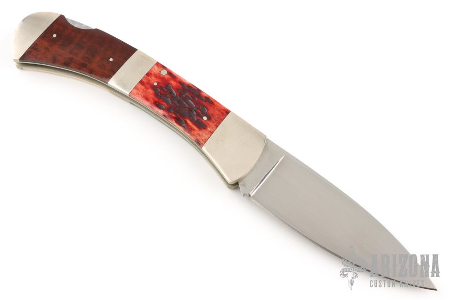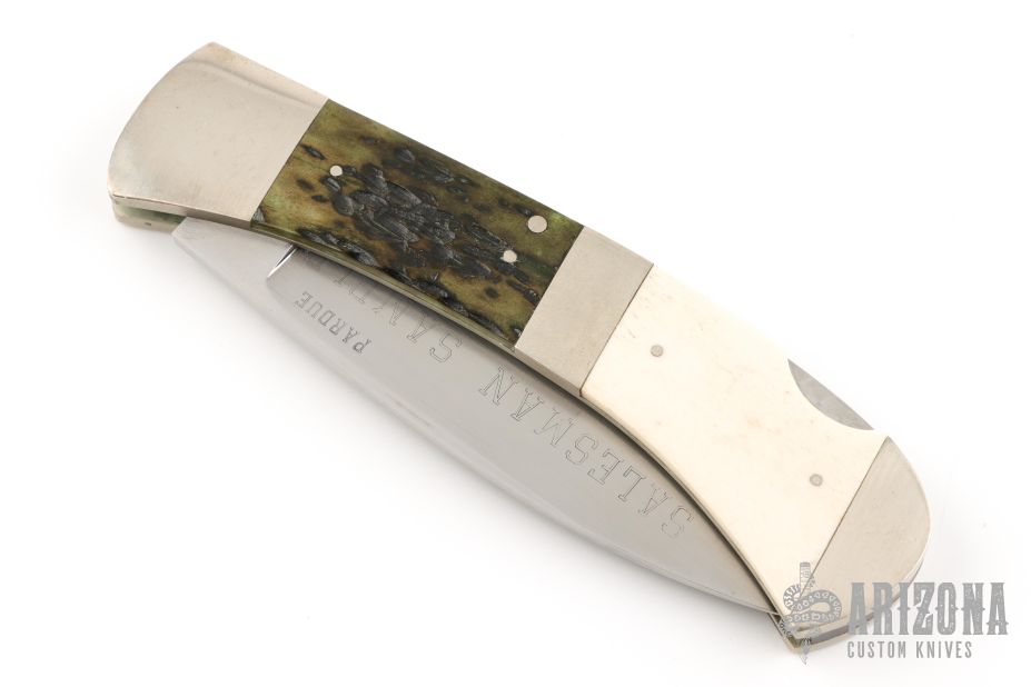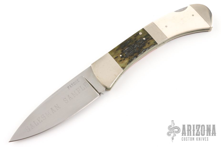 This lockback folder by Mel Pardue features a hand rub satin finished blade that says "SALESMAN SAMPLE" on the blade. The handle has nickel silver bolsters and liners, multi-piece scales that are jigged bone, white bone and snakewood, stainless steel backspacer. Nice lockup and blade seating. #057 on blade. Has light scratches, otherwise excellent condition. Comes with a zippered case.