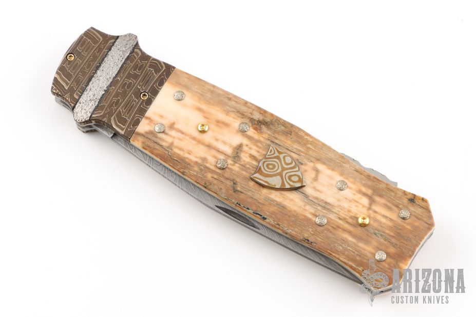 This knife by WD Pease features a Feather Damascus blade with nail nick. The handle has Mosaic Damascus bolsters with stippling, mammoth ivory scales with textured nickel silver pins, mokume escutcheon, gold plated screws, fileworked stainless steel backspacer. Comes with a zippered case. Excellent condition.