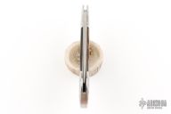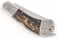 This lockback by Ronald Hewitt features a hand rub satin finished blade with nail nick. The handle has dovetailed and engraved stainless steel bolsters, buffalo horn scales, stainless steel liners and backspacer. Has a couple light scratches, otherwise excellent condition. #TP002 on the blade. Comes with a zippered case. Engraving done by "K.W. WARREN"