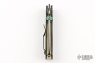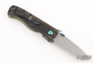 This CQC-7 by Emerson Knives features a chisel ground tanto blade with notched thumbrest, wave feature, and an anodized clover shaped thumbdisc. The handle has an anodized titanium pivot, dark bogwood scales, anodized liners, titanium posts, and tip up stainless steel clip. Comes with original box and papers. Comes with a "Lucky Penny" Comes with a Dendrochronological Dating Certificate dating the wood to 4663BC to 4496BC. Excellent condition.  #5925 on blade.