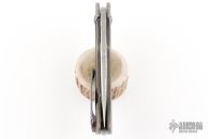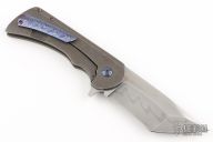 This custom Honor Tanto flipper by Rick Barrett has a 1095 tanto recurve blade with a beautiful hamon line. The handle has an acid tumbled titanium frame, anodized titanium backspacer and a tip up MokuTi clip. Hardware has also been anodized. Nice detent, lockup and blade seating. Comes with a nylon zippered case. Has some scratches and a couple oxidation spots, otherwise good condition.