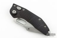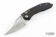 This Stitch Auto by Microtech Knives features a stonewash finished blade and false top edge, notched thumb and finger rests. The handle has a black milled aluminum handle with a bead blasted titanium backspacer and a bead blasted stainless  steel clip, tip up carry, lanyard hole at the butt. Comes with original box and papers. S/N of 10360 and dated 05/2022. Excellent condition.