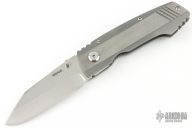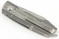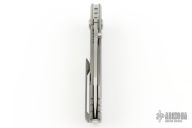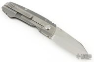 This Uber frame-lock by Jim Harrison of Seamus Knives features a satin finished clip point blade with single thumbstud. Features IKBS (Ikoma Korth Bearing System). The handle has a milled and two-tone finished titanium frame, fileworked titanium backspacer with GITD inlay, and a machined and mortised titanium clip tip up carry. Nice lockup, detent and blade seating. Comes with a cloth case and COA . Has a couple light scratches, otherwise excellent condition.