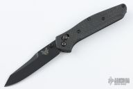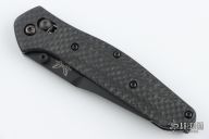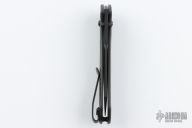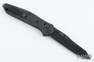 This 940BK Osborne Axis Lock Folder from Benchmade has a black coated clip point blade with false top edge and dual thumbstuds. The handle has carbon fiber scales from Flytanium, Flytanium black hardware and a MXG titanium deep carry clip. Nice blade seating and lockup. Comes with original box, papers, and drawstring pouch. Excellent condition. Comes with original scales and hardware.