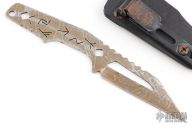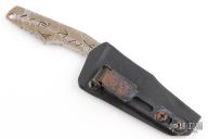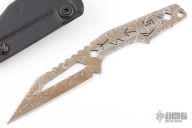 This Stark V2 by Bawidamann Blades features a bronze acid etched finish on the blade, has notched thumbrest, .100" blade stock and 1.030" blade depth, full tang construction. Comes ready to carry with the Bawidamann Uberscabbard with Ulti-clip. Has been used, has some light scratches and oxidation on the tang, has some rust on the Ulti-clip otherwise good condition.