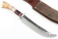 This Fighter by Jim Behring features a satin finished clip point blade with forged flats, .251" blade stock and 1.82" blade depth, hidden tang construction. The handle has a nickel silver guard, spacer pattern consisting of black/red/blue/aluminum, horsehide stacked leather, and pinned carved stag grip. Comes with original paper wrap, leather belt sheath with premium panel. As new from maker, unused condition.