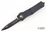 This Troodon by Microtech features a black blade with one fully serrated edge. The handle has a black aluminum frame with black hardware and tip down clip. Dated 05/2019 s/n 3991. Comes with original box and papers. Has some scuffs and scratches great condition otherwise.