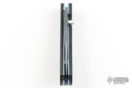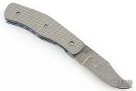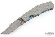 This knife by Jake Elenbaas features an Alabama Damascus blade with single thumbstud with a jewel inlay. The handle has carbon fiber scales, anodized titanium liners and a black G-10 backspacer. Comes with COA. New from maker.