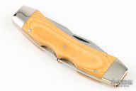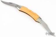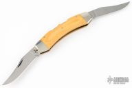 This Texas Lock Horn by Case Knives features two satin finished blades with nail nicks. The handle has nickel silver bolsters, yellow paper micarta scales, brass liners and stainless steel backspacers. Comes with a tooled brown leather sheath. Has a few light scratches, otherwise excellent condition.