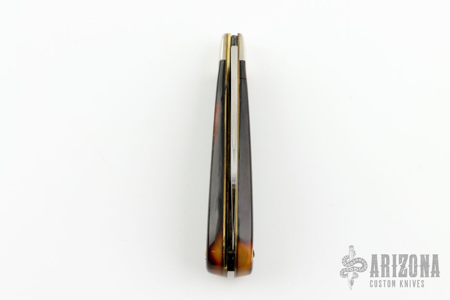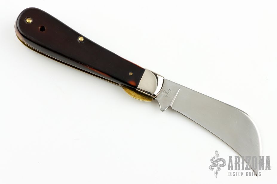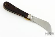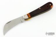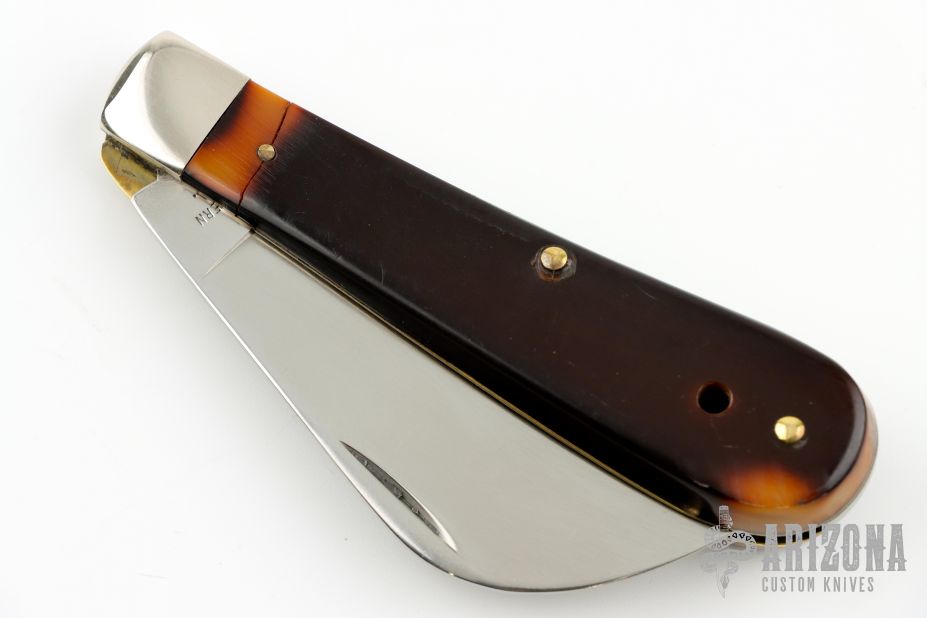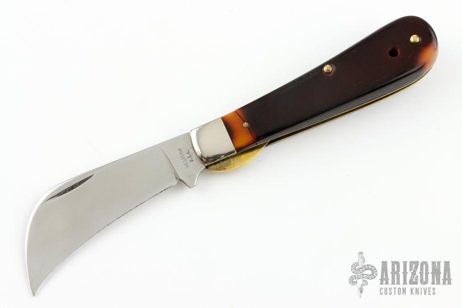 This Pruner by Western Cutlery features a satin finished blade with nail nick. The handle has nickel silver bolsters, faux horn scales, brass liners and locking liners, steel spring. Has half-stop. Comes with original box. Has a few light scratches and a crack in the front scale, otherwise good condition for its age.