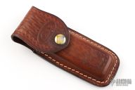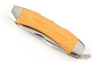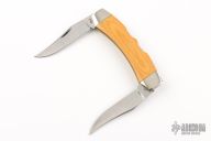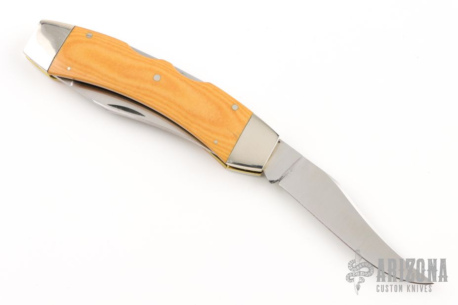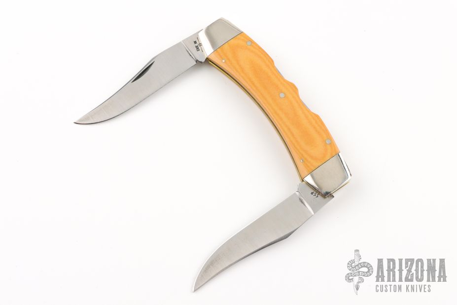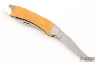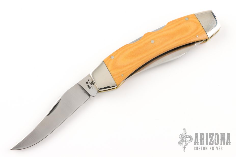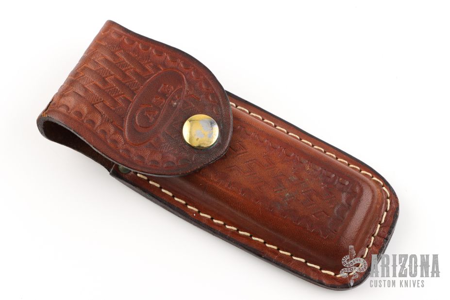 This Texas Lock Horn by Case Knives features two satin finished blades with nail nicks. The handle has nickel silver bolsters, yellow paper micarta scales, brass liners and stainless steel backspacers. Comes with a tooled brown leather sheath. Has a few light scratches, otherwise excellent condition.