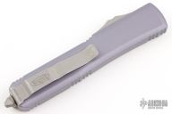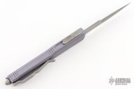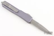 This Ultratech OTF automatic features a bayonet grind apocalyptic finished blade with a partially serrated edge and a gray anodized aluminum handle. Stainless steel clip. Glass breaker. Serial number 168000 and dated 06/2020. Comes with original box and papers. Excellent condition.
