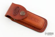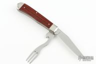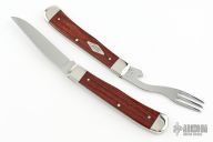 This Hobo Knife by Case features both a knife and a fork blade. Nickel silver double bolsters and wood covers over nickel silver liners. This knife also separates down the middle into a knife and fork, so that both can be used together. Has a couple light scratches, otherwise excellent condition. Comes with original brown leather sheath.