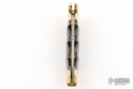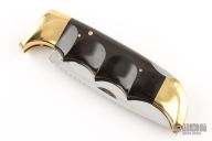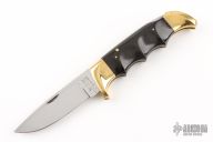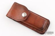This Folding Field Model 1050 by Kershaw features a mirror polished drop point blade with notched thumbrest and nail nick. The handle has brass bolsters and liners, black scales. Has some scratches, otherwise good condition. Nice lockup. Comes with a brown leather sheath.
