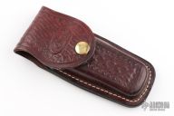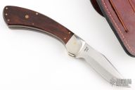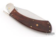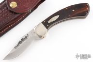 This Case folder features a satin finished drop point blade. Nickel Silver front bolsters, wood scales with a Case escutcheon lock release. Brass liners and steel springs. Includes original sheath. Has a couple light scratches, otherwise excellent condition.
