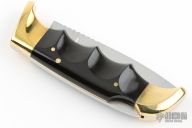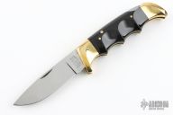 This Folding Field Model 1050 by Kershaw features a mirror polished drop point blade with notched thumbrest and nail nick. The handle has brass bolsters and liners, black scales. Has a couple light scratches, otherwise excellent condition. Nice lockup. Comes with a brown leather sheath.