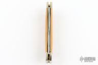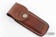 This Texas Lock Horn by Case Knives features two satin finished blades with nail nicks. The handle has nickel silver bolsters, yellow paper micarta scales, brass liners and stainless steel backspacers. Comes with a tooled brown leather sheath. Has a few light scratches, otherwise excellent condition.