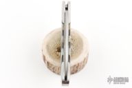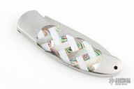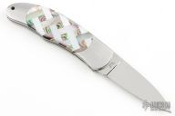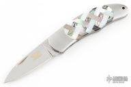 Moki Lockback with plain edge VG-10 stainless steel blade. Stainless steel frame with mother of peal, black lip pearl and abalone inlays. Nail nick and back lock. Leather pouch. Made in Japan. Excellent condition.
