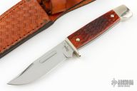 This hunter by Case features a mirror polished blade with fullers, false top edge and notched thumbrest, .104" blade stock and .943" blade depth, full tang construction. The handle has a nickel silver guard and rear bolsters, jigged bone scales with black liners. Comes with a tooled brown leather sheath. Excellent condition.