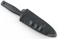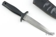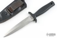 This vintage boot dagger by Valor features a satin finished double edged blade with .216" blade stock and .907" blade depth, hidden tang construction with a black aluminum grip. Comes with a black leather boot sheath. Has some scratches, otherwise good condition.