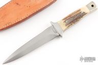 This Dagger by Valor features a satin finished double edged blade with .185" blade stock and 1.004" blade depth, full tang construction. The handle has a nickel silver guard and butt with stag scales. Comes with a brown leather sheath, but the snap on the keeper is broken. Has light scratches, otherwise good condition.