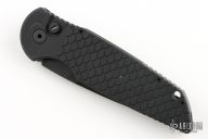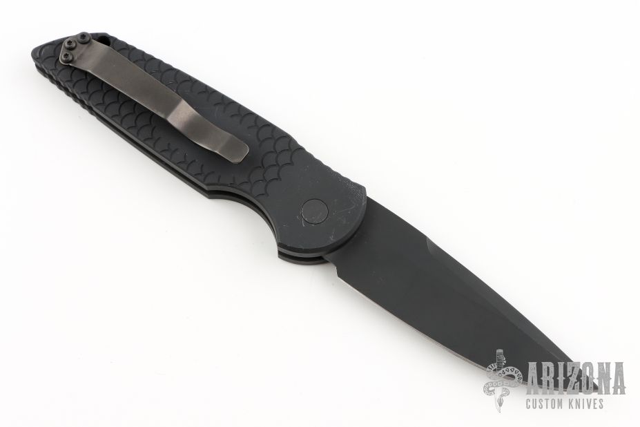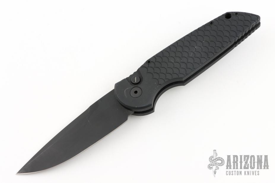 This Tactical Response TR-3 X1 features a "Fish Scale" milled, black anodized aluminum body, which provides good traction and looks great. The blade has a black 154-CM stainless steel with a plain cutting edge. The TR-3 is a knife that won't let you down. It fires hard, locks up like a rock, and feels great in hand. The slim design sits comfortably for tip-up pocket carry. Tritium is inset into the firing button, adding a unique and awesome flare to the piece. Includes the original box and papers. Has scuffs and scratches, great condition otherwise.