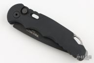 This TR-5 automatic model has a black anodized aluminum handle with a two-tone black back spacer/lanyard attachment, and a deep carry tip-up pocket clip. Its blade is made from CPM-S35VN stainless steel in a black finish. A sliding safety lock allows secure pocket carry and prevents accidental blade deployment.