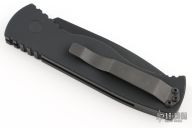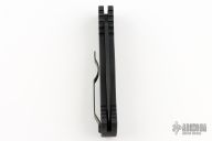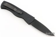 This knife features a black blade with notched thumbrest. The handle has a black aluminum frame with black hardware and black stainless steel tip up clip.  There is a lantern inlaid into the push button.  Comes with original box and papers. Has some scuffs and scratches, great condition otherwise.