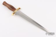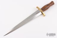 This Model 13-12 Arkansas Toothpick by Randall Made Knives features a satin finished carbon steel double edged blade with .207" blade stock and 1.672" blade depth, hidden tang construction. The handle has a lugged brass guard and scalloped coolie cap butt, wood grip with black spacers. Comes with a brown leather sheath. Excellent condition.