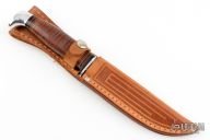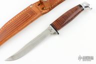 This knife by Case has a satin finished blade with false top edge, fullers and a notched thumbrest, .107" blade stock and .735" blade depth, hidden tang construction. The handle as an aluminum guard and butt, stacked leather grip with red/black spacers. Comes with a brown leather sheath. Has a couple light scratches, otherwise excellent condition.