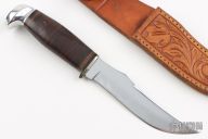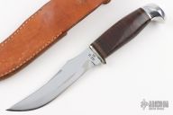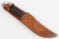 This knife by Case has a mirror finished blade with false top edge and a notched thumbrest, .103" blade stock and 1.014" blade depth, hidden tang construction. The handle as an aluminum guard and butt, stacked leather grip with red/black spacers. Comes with a brown leather sheath. Has light scratches, has been sharpened, otherwise good condition.