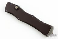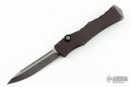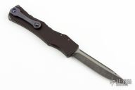 This Halo IV by Marfione Custom Knives features a two-tone Dark Matter finished hand ground blade. The handle is black hard coat anodized aluminum with Dark Matter finished stainless charging handle and purple haze screws, and a tip up titanium clip with ceramic ball insert. Comes with a kydex sheath that covers the button and has a cord with a clip on the end to attach to your pants. When the knife is removed from your pocket the cord holds the sheath and the knife comes right out, this provides a cover for the button in your pocket, this knife has no safety otherwise. Comes with original box, zippered case and COA dated 09/2017. Has a scratch on the clip and a few light scuffs, otherwise excellent condition.