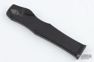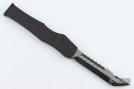 This Halo VI by Microtech Knives features a DLC Hellhound blade with satin flats and notched thumbrest. The handle has a black aluminum frame and titanium charging handle. No safety. Comes with a kydex sheath with belt clip, original box and papers. Dated 03/2019 and s/n 079. Excellent condition.