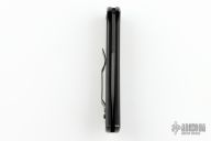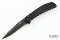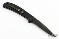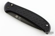 This Eagle Auto by Al Mar Knives has a black drop point blade with false top edge. Handle is black "crow's feet" contoured aluminum with lanyard hole and bead blasted stainless steel tip up clip. Has safety. Comes with original box. Has some light scuffs, otherwise excellent condition.